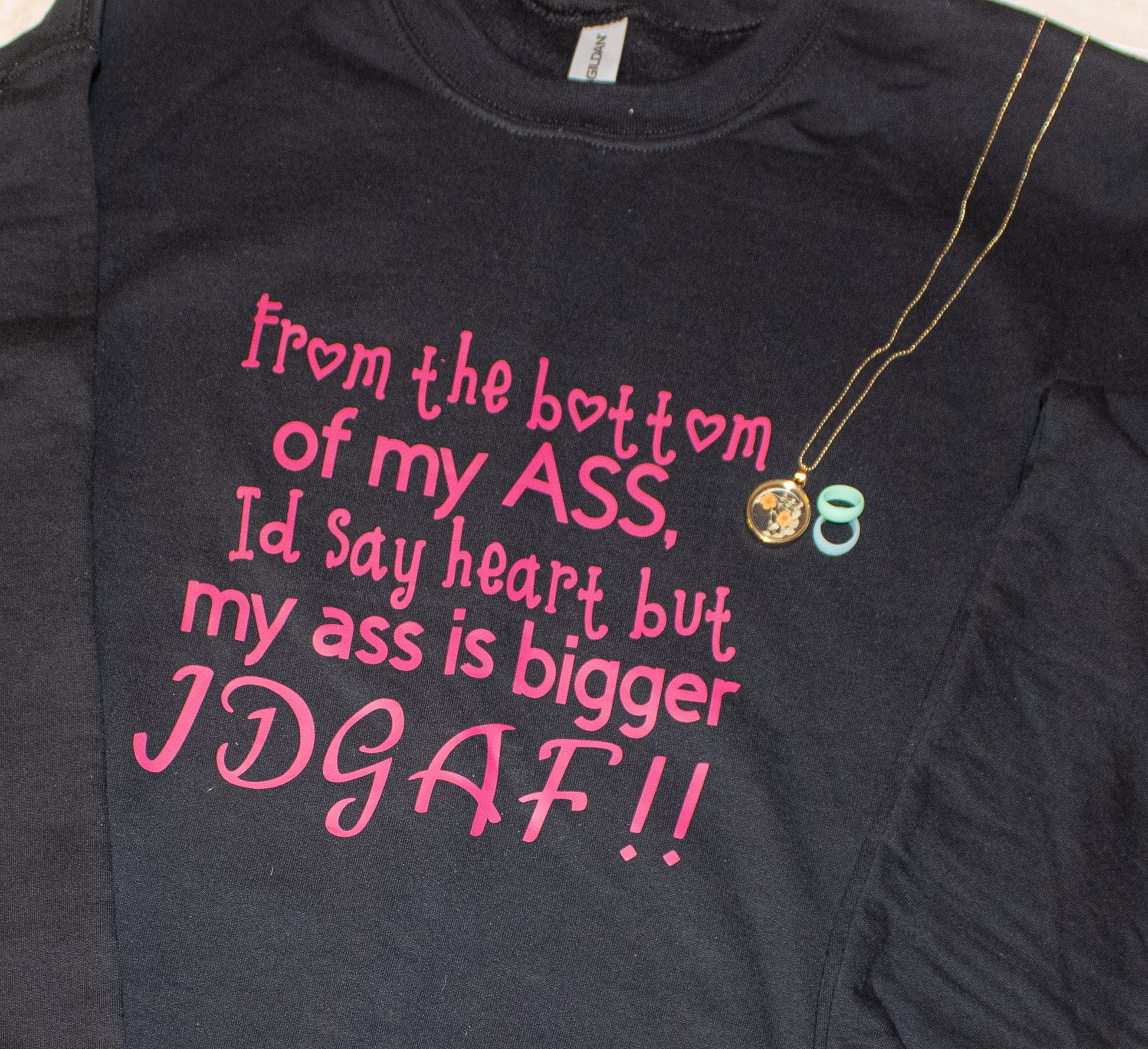 Black color shirt- Gildan brand with pink lettering.
