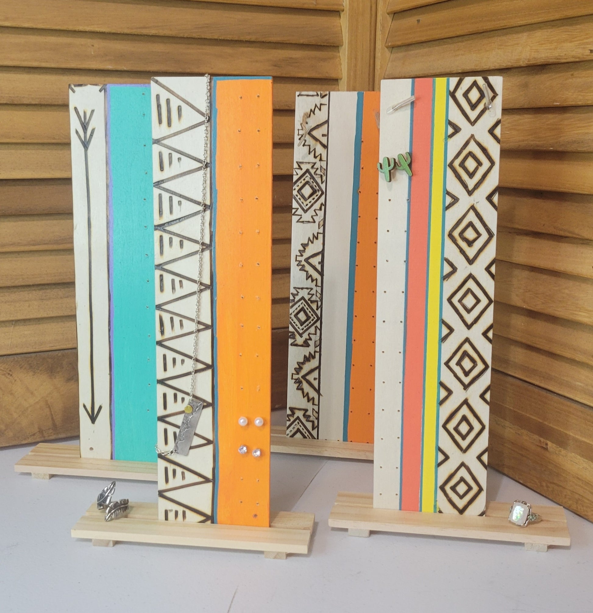 Handcrafted Jewelry holders are meticulously crafted pieces designed to not only store your precious jewelry but also serve as decorative accents. Hold necklaces, bracelets, rings and 12 to 14 pair of earrings.  Two pieces as to personalize to your liking.