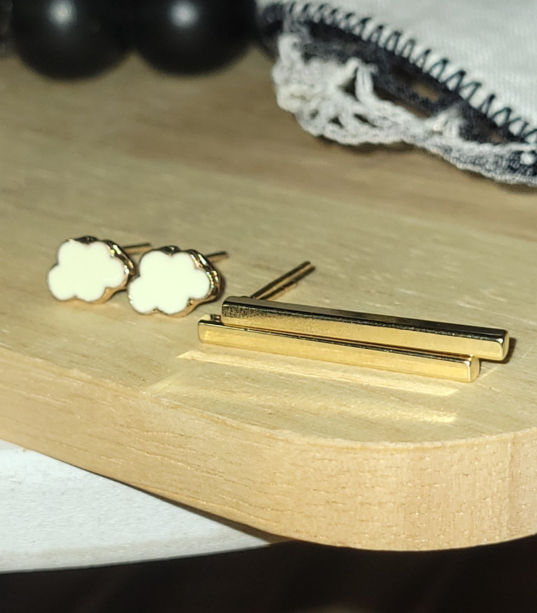 The mixture of cloud studs with gold-plated bar studs creates a delightful combination of charming and elegance to your jewelry box. Together, these earrings offer versatility allowing you to switch between a fun and lighthearted style to an elegant look.