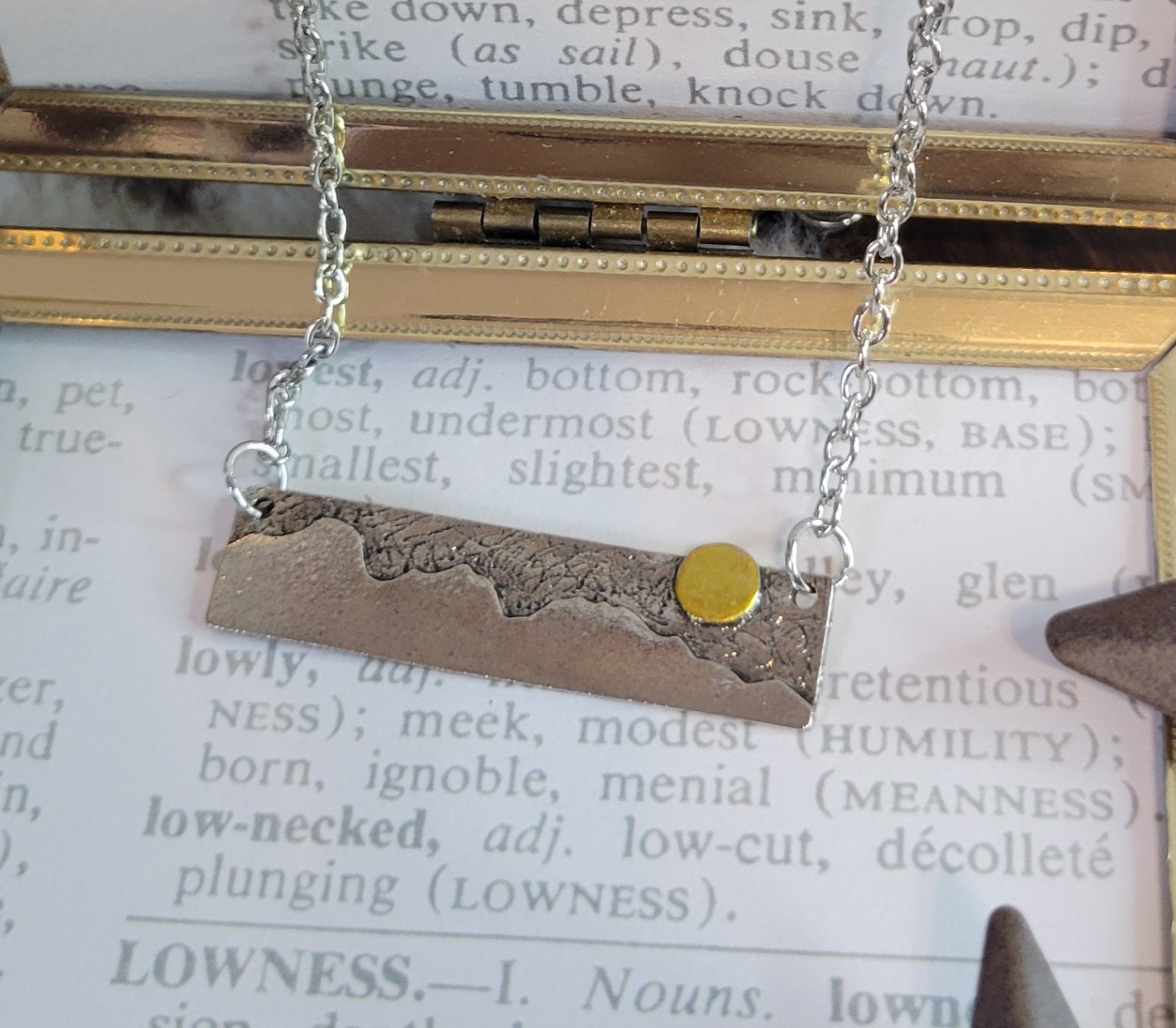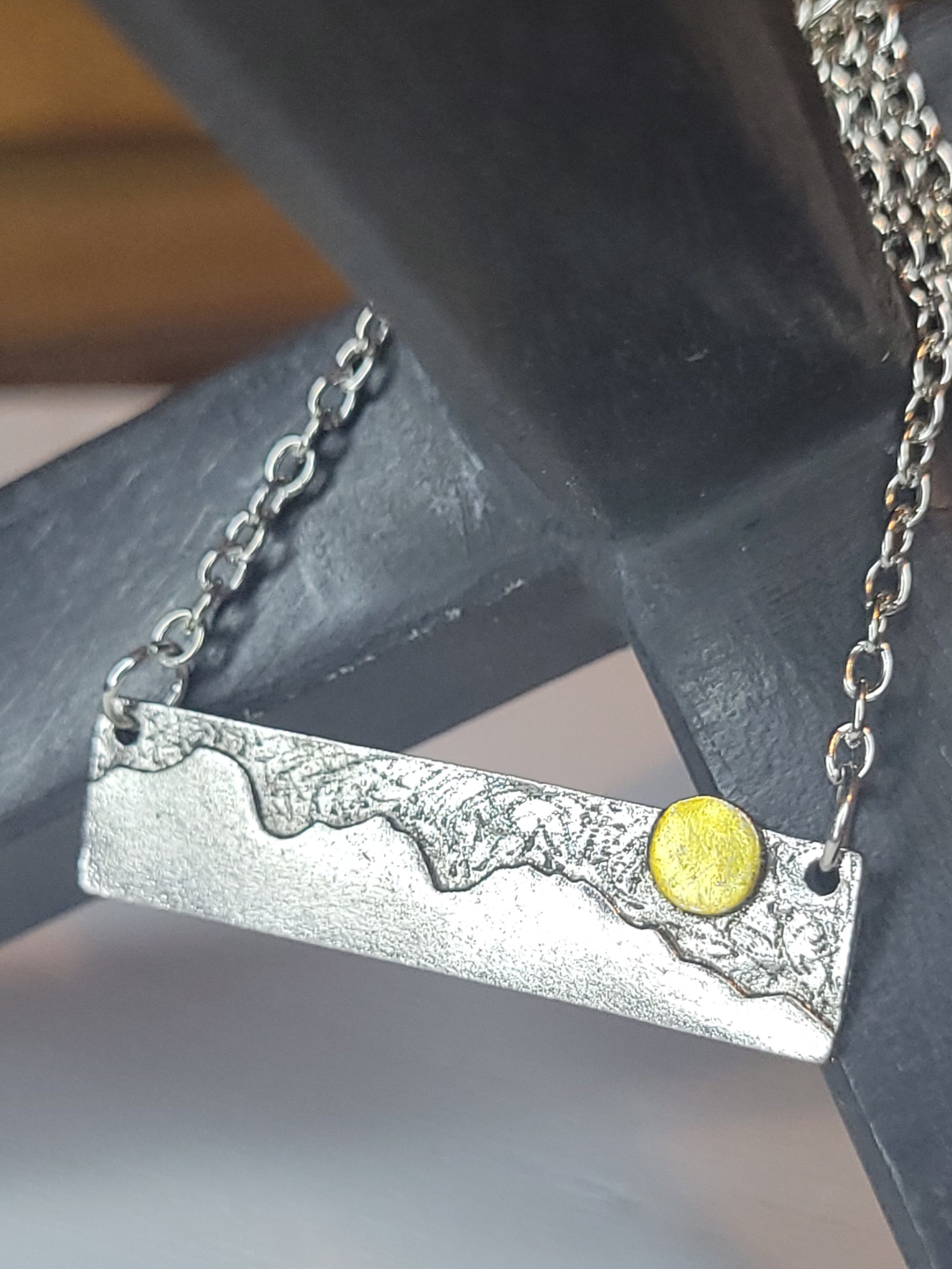 Mountain sunset bar pendant suspended gracefully on a silver-plated chain. The pendent showcases a captivating mountain sunset, expertly crafted with intricate detailing. Elegance is added with the silver-plated chain. Making this necklace a perfect accessory that captures nature's twilight moments in a different way.