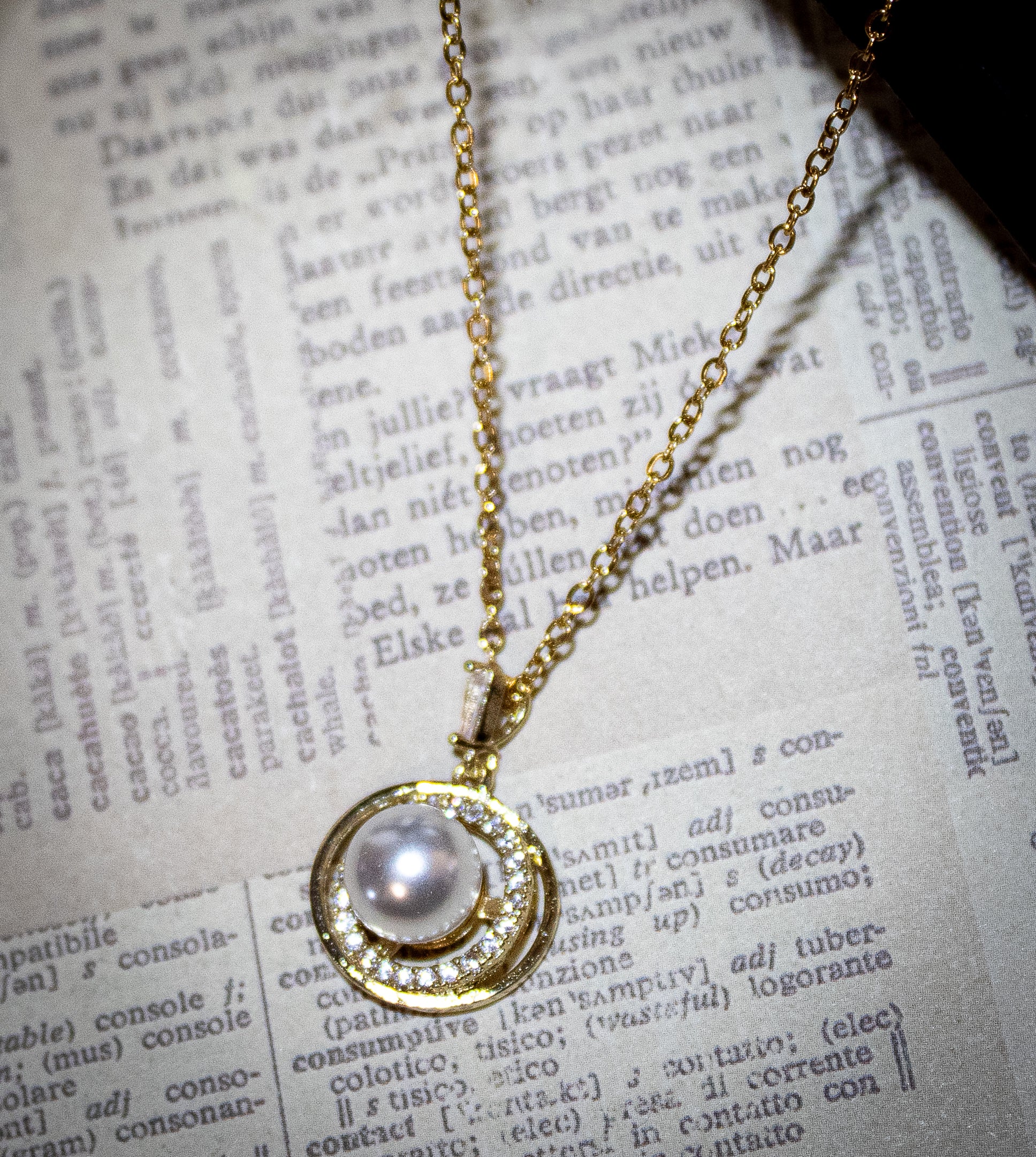 This exquisite collarbone necklace featuring a gold-plated sterling silver pendent. The pendent take a delicate circle shape adorned with dazzling jewels around a large freshwater pearl a blending of glamour and sophistication. Its timeless charm makes it an ideal accessory for both formal and everyday wear.
