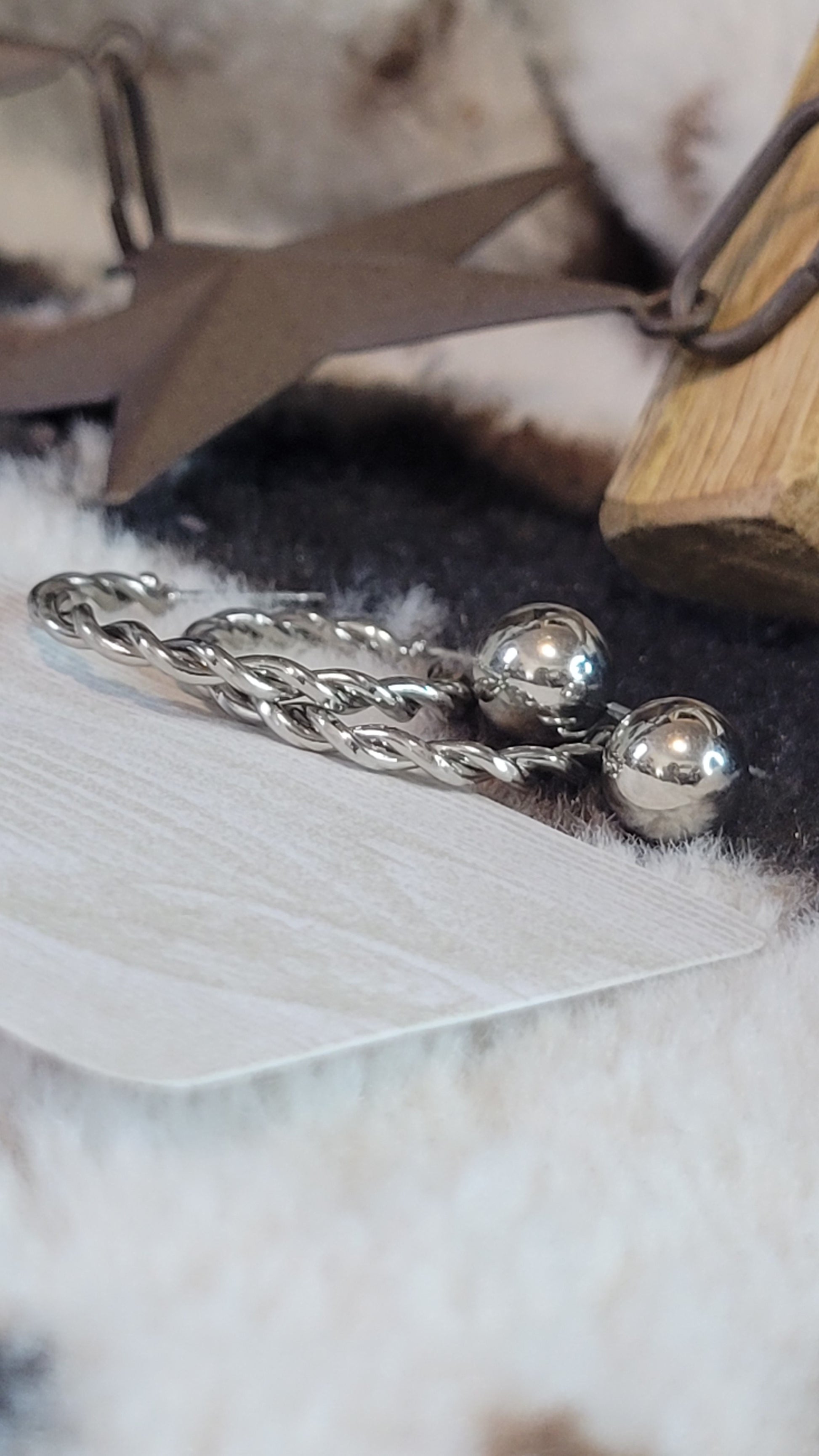 Pairing silver round studs with stainless steel twisted hoop earrings creates a versatile & stylish earring combination. This pairing allows you to switch between classic and understated style with the silver studs to a trendier & edgy look with the twisted hoop earrings. Great addition to your jewelry box.