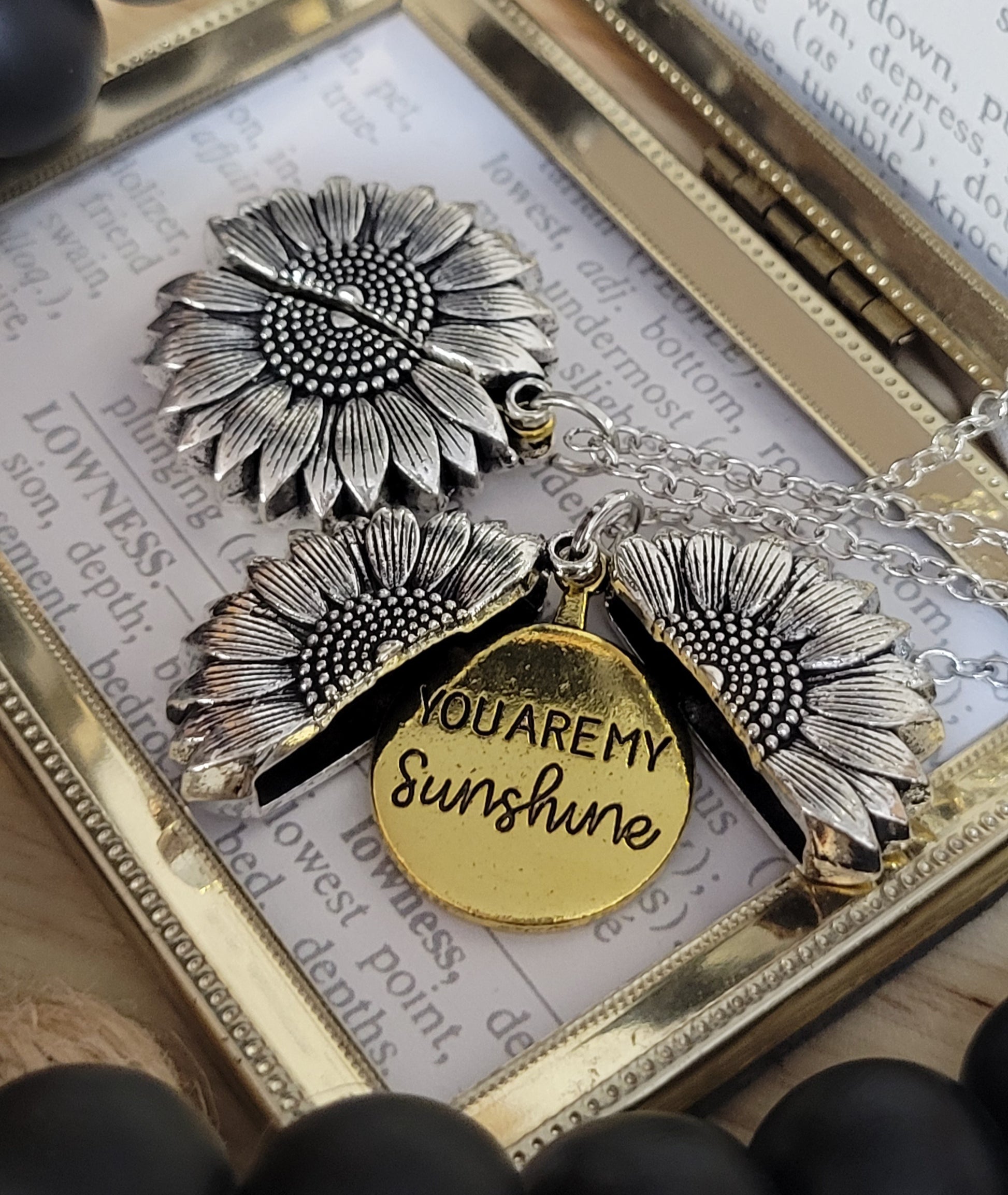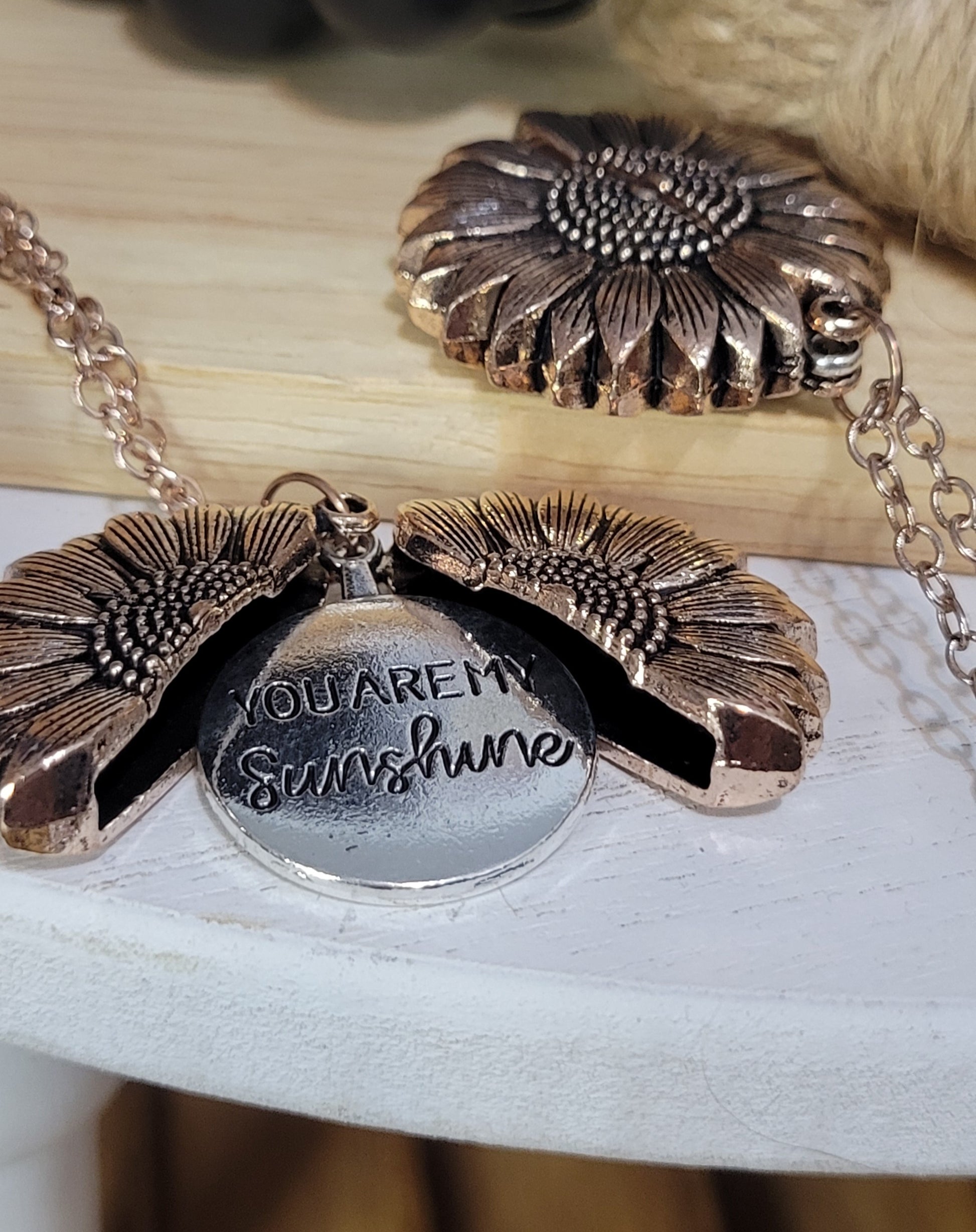 This sunflower pendant necklace holds a hidden message that reads, "You are my sunshine." Suspended from a 21cm stainless steel chain this accessory will add a beautiful heartfelt declaration of affection.  Everyone would love to have this in their jewelry box.