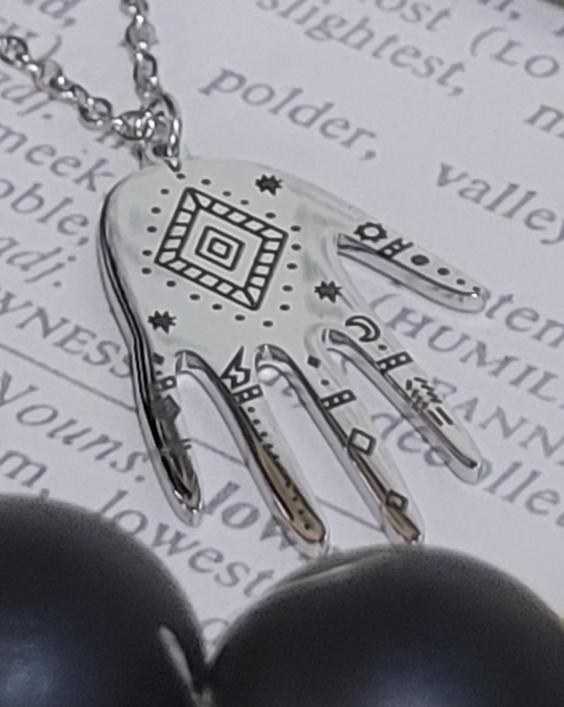 Embrace mysticism and artistry with a tattoo tarot hand pendant necklace.  This unique necklace features a pendant shaped like a hand adorned with intricate tattoos.  Hand pendant displayed on stainless steel chain makes for a symbolic piece for anyone who appreciates the tarot.