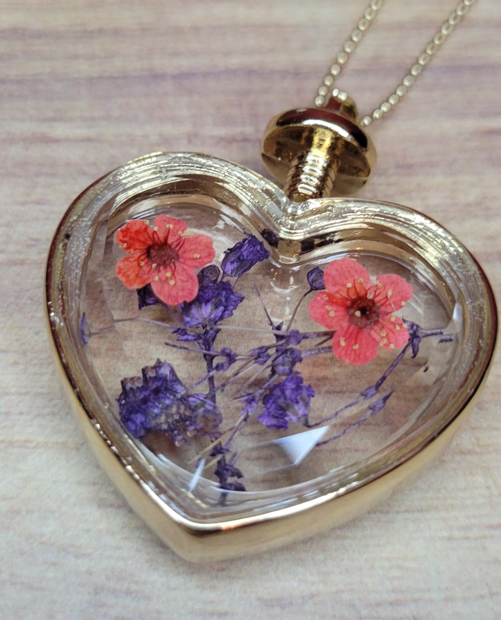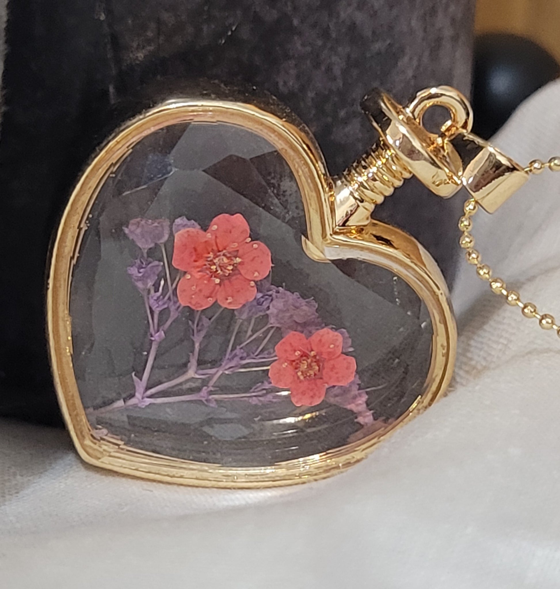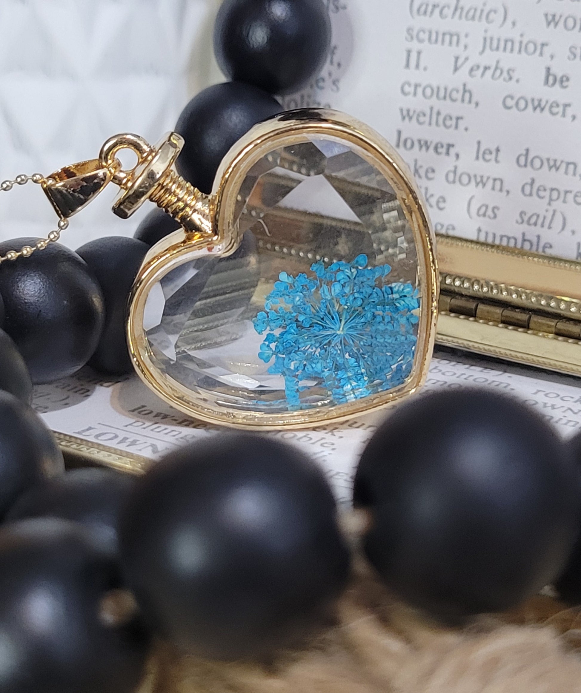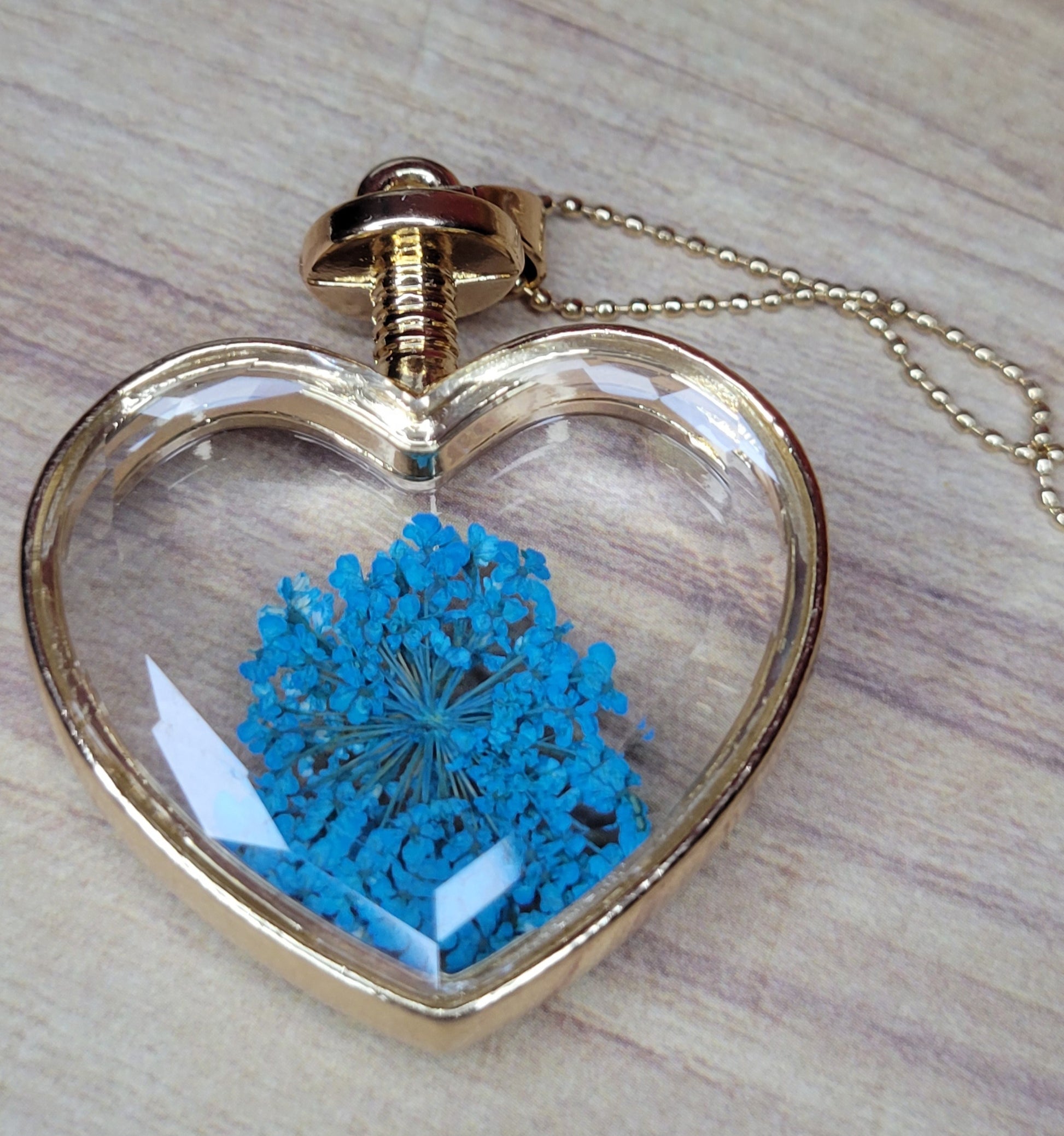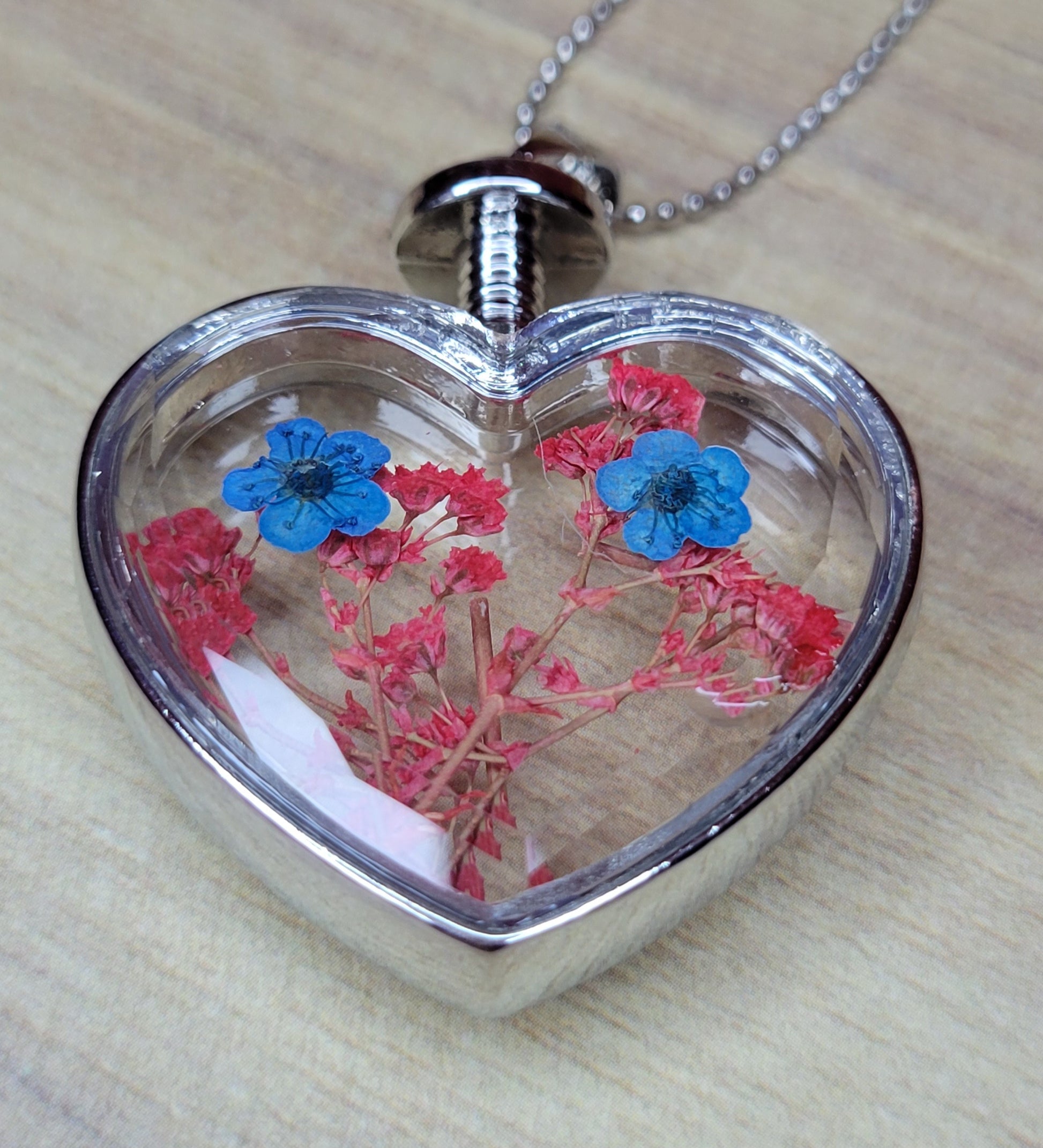 Capture the essences of nature's beauty with a heart-shaped pending featuring a blue & red wildflowers.  This charming pendant is a tribute to the wild and delicate of nature encased within a heart-shaped pendant. The long chain adds a touch of whimsy and allows to you wear it in comfort.