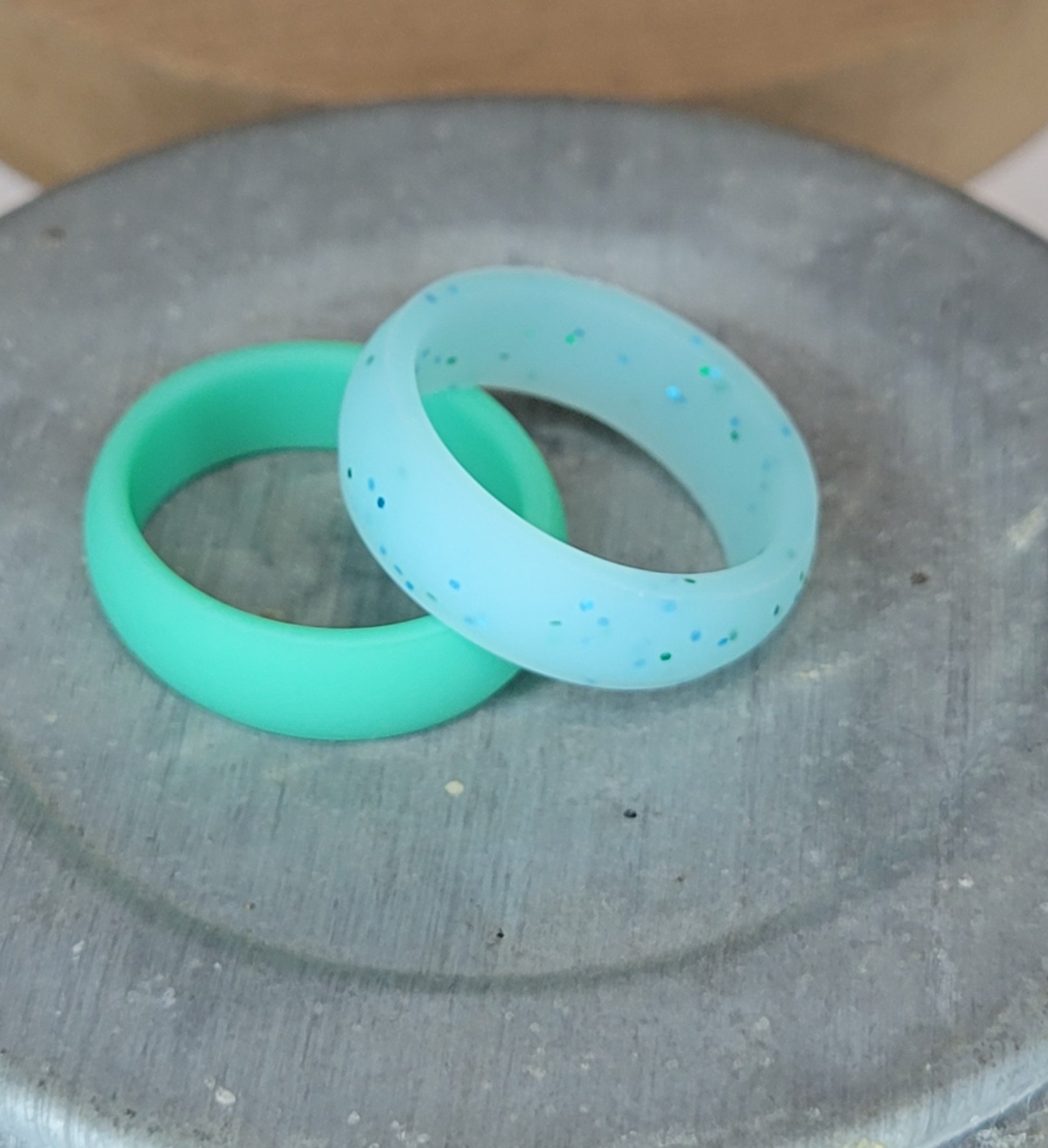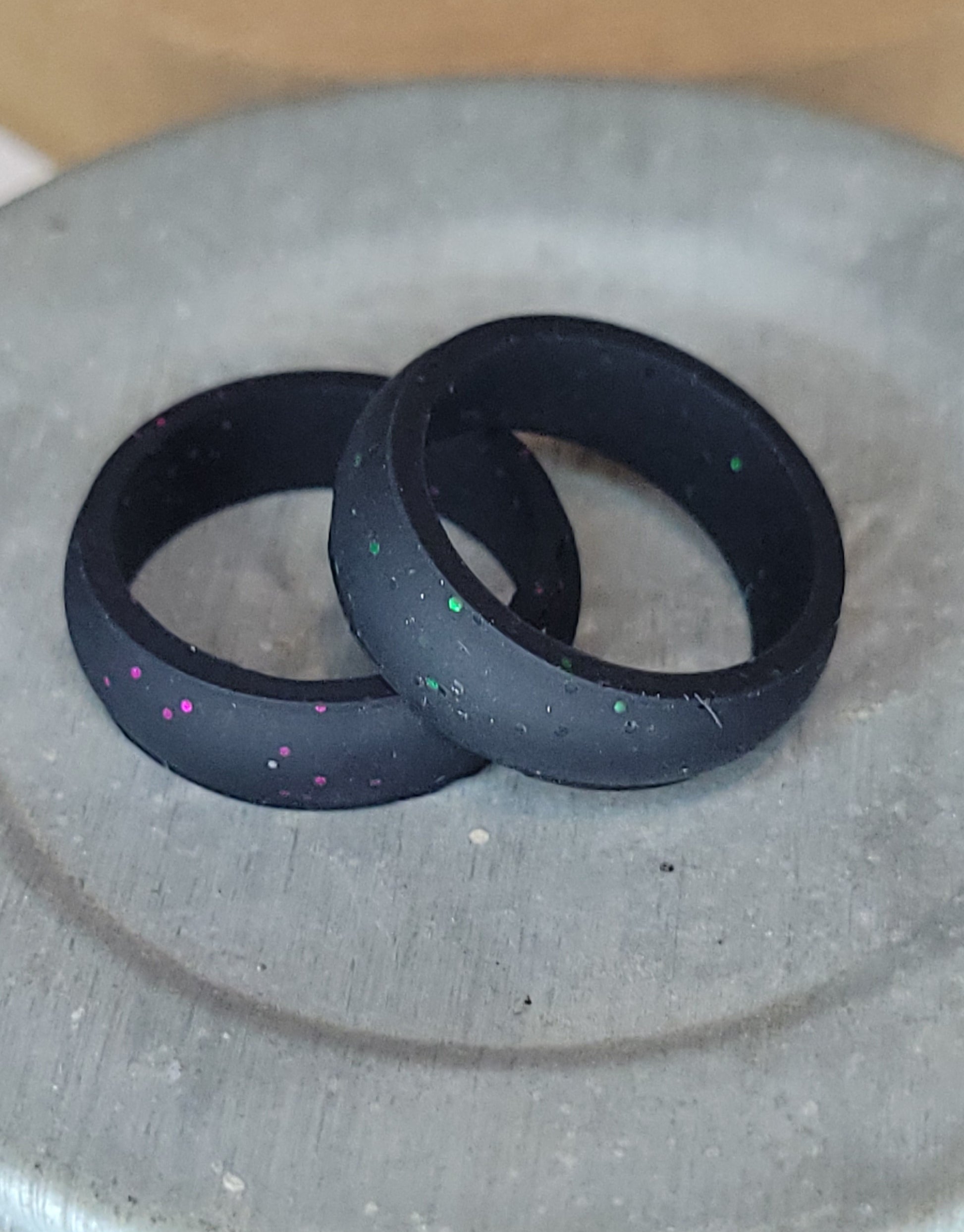 A set of two women's silicone rings: one glitter one plan, offers both comfort and style. Rings designed to be lightweight, durable and flexible. The addition of glitter adds a touch of sparkle, making these not only practical but also fashionable.